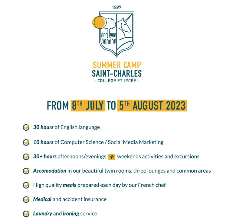 T-shirt of the camp, photo pack, registration fees, health insurance, afternoon and evening activities, welcome pack, housekeeping, laundry twice per week, meals (breakfast, lunch, dinner, snacks), concierge service for the parents (hotel booking, advanced check-in, etc.), language classes, and class materials.
